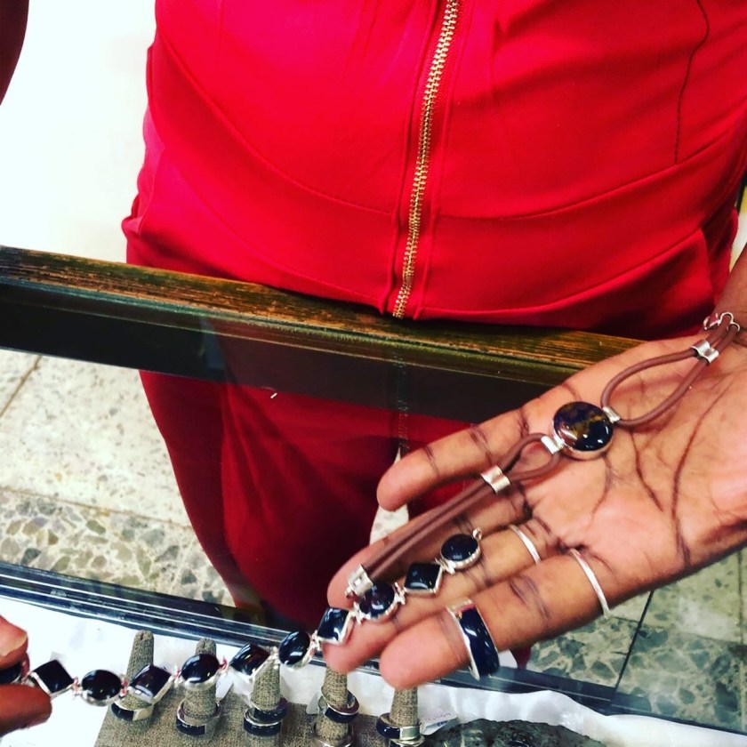 y ya entramos en el taller para aprender un poco sobre el Coral negro (que solo hay aquí y en Cuba) bueno para los nervios, ansiedad y hipertensión, sobre el Larimar (autóctono de aquí) la piedra color azul claro, llamada piedra del amor y el ámbar, que hay de varios tipos como amarillo, verde, marrón, rojo y azul (el azul es muy raro y solo se encuentra aquí y solo se ve azul con luz LED).
