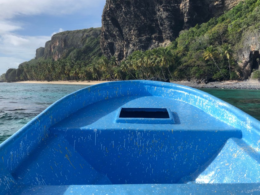 Al día siguiente el mar estaba agitado pero, muy decididos, nos hemos aventurado a ir las playas como queríamos desde el principio. En la playa hay gente siempre ofreciendo sus servicios y conocimos a Toy (tlf: 0018092672506) que contratamos para ir en su yola (embarcación de pescadores típica) para ir a la playa Frontón. El camino fue muy animado porque el mar estaba animado… pero el capitán iba de pie y muy seguro y llegar solos a esta playa remanso de paz, corales y aguas cristalinas… valió la pena el momento «Titanic». Yo creo que por un momento pensamos que no sobrevivíamos. El mar ha “brincado” un poco pero hemos llegado sanos y salvos.
